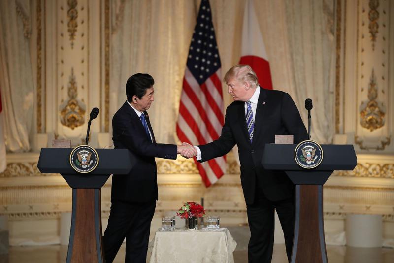 美日兩國宣布展開貿易對話,特朗普與安倍晉三聯手舉行的聯合發布會上說:「美國承諾自由、公平和互惠的貿易,同時致力於達成有利於美國和日本的雙邊貿易協議。」安倍晉三回應稱,他留意到美國對雙邊協議感興趣,惟日本則希望從跨太平洋夥伴協定(TPP)對兩國是最佳選擇的角度來進行討論。