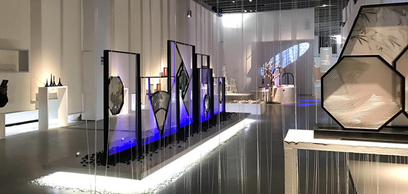 主展品「窗影流光」落地屏風組合,以太湖石為意象,運用中國水墨手繪、傳統手工雙面繡及現代光纖技術,用真絲、綃等材質,在APP的調控下,光纖明暗色彩變化,疏影橫斜,暗香浮動,生動展示中國園林以花窗創造出別具一格的「納千頃之汪洋,收四時之爛漫」空間美感。