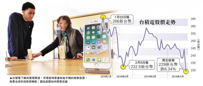 美國蘋果公司主要供應商之一、中國台灣半導體製造商台積電(TSMC)發表令市場失望的營收預測,以及其第二季度營收未如預期,引發市場對全球智能手機銷售前景的憂慮,韓國三星股價跌2.2%,日本東京電子亦跌2.05%,連帶全球其他晶片股同受牽連報跌。美股方面,道指早段反覆,曾跌242點,報24422點;納指亦曾跌1.28%,報7145點。金融機構OTR Global周五因蘋果在中國的業務前景轉差而把其股份的投資評級由正面調低為好壞參半後,蘋果股價曾大跌3.63%,最低見166.53美元,創兩個月來最大跌幅。蘋果股價在兩天內最多合共跌了6.4%。/大公報記者 鄭芸央