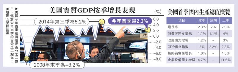 圖:美國今年首季經濟增長百分之二點三,遜於去年末季的百分之二點九;美股周五早段反覆