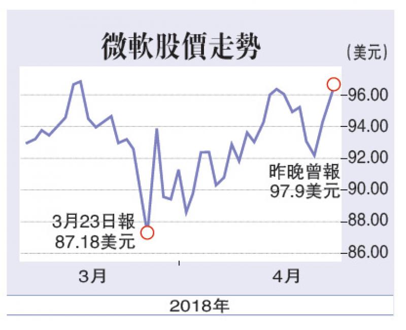 微軟上季業績表現理想,支持股價向上,周五曾漲3.86%至每股97.9美元。