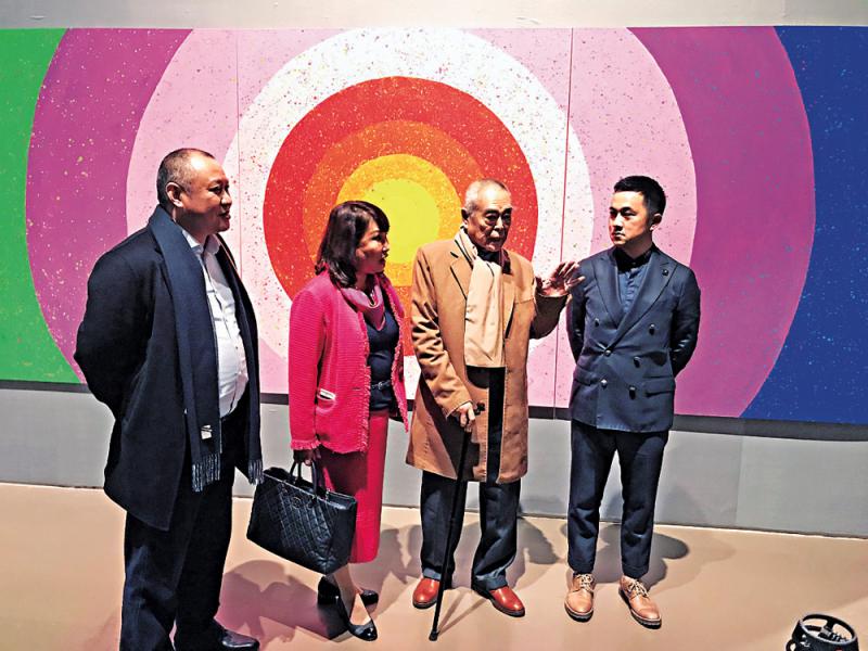 圖:蕭勤(右二)生於上海,旅居海外數十載,帶着作品「回家」,其背後為作品《大同》