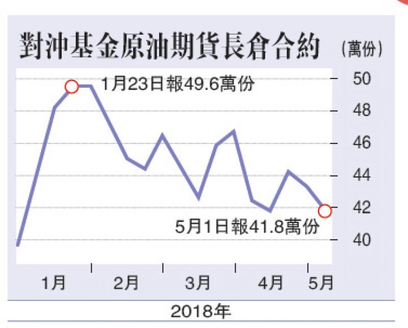 【大公報訊】記者鄭芸央報道:美國油價升破每桶70美元,對沖基金經理卻減持美國原油期貨好倉,根據美國商品期貨交易委員會數據顯示,在截至五月一日為止的一周,對沖基金減持紐約期油淨長倉3.5%,至41.8萬份期貨及期權合約。市場數據同時顯示,布蘭特原油期貨淨長倉減少3.4%,至59.1萬份合約。投資經理增持美國汽油淨長倉1.2%至創紀錄水平,柴油淨長倉亦升1.8%。