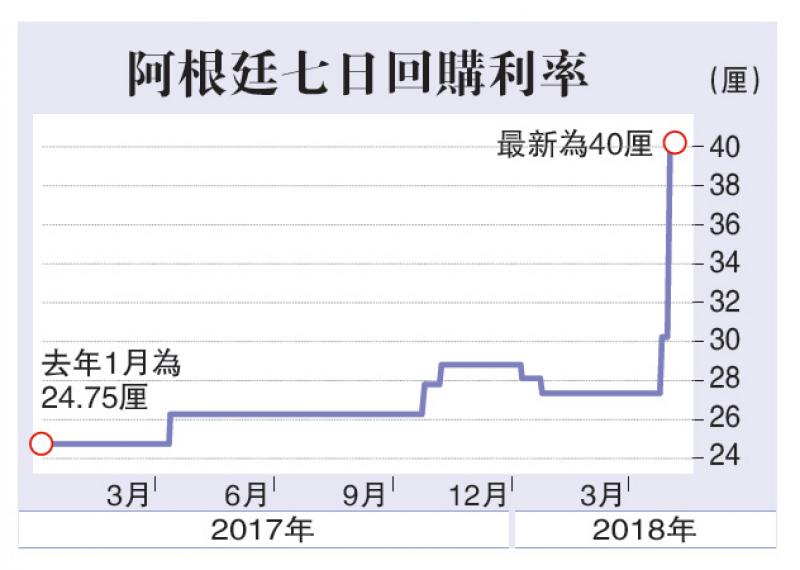 阿根廷為了捍衛當地貨幣披索,在周一把利率調高至40厘;然而,阿根廷披索的跌勢卻未有結束,周二曾再跌1.79%,至每美元兌22.2515的水平,年初至今更已大跌了逾兩成。