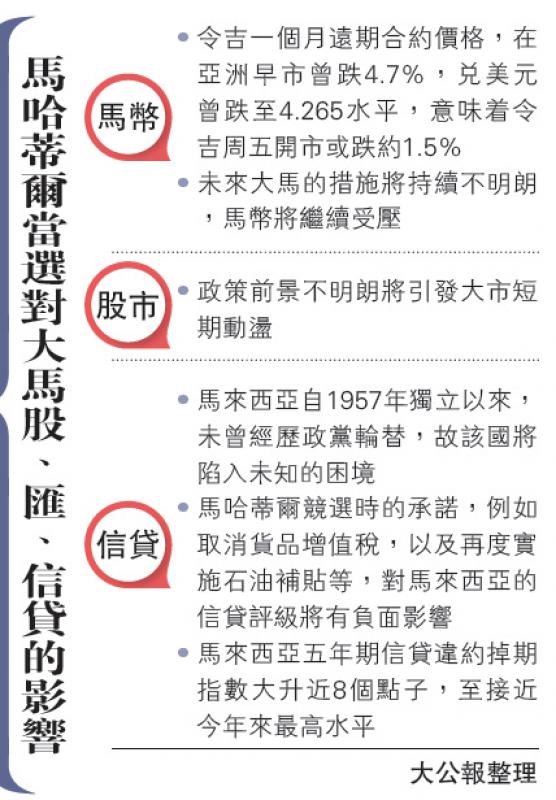 馬來西亞反對派出其不意勝出選舉後,令大馬前景陷入極不明朗狀態,拖累當地貨幣令吉的一個月遠期合約價格,在場外大跌了4.7%,預示周五開市後令吉將會下跌近1.5%。此外,馬國經濟前景頓時變得不明朗,其信貸違約風險亦急升;國際評級機構穆迪認為,該國的信貸環境將會變得更趨負面。\大公報記者 李耀華