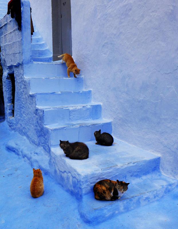 舍夫沙萬有很多貓,悠忽與人擦身而過,神色淡定地說明,牠們才是這座城市的真正主人。貓的慵懶、神秘、優雅、古怪、驕傲……無邊無際的藍色成為貓們構築的故事情節了。梁二平這樣形容:沒有貓的撩撥,舍夫沙萬的藍色就是一坨寂寞的水蒸氣,最終,是這些貓讓舍夫沙萬的藍色真正成為了致幻劑。