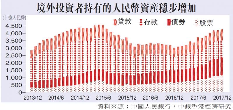 根據IMF資料,全球官方儲備持有的人民幣資產從2016年底的907億美元上升19%至1079億美元,同期境外投資者持中國債券總量上升32%至10224億元人民幣。