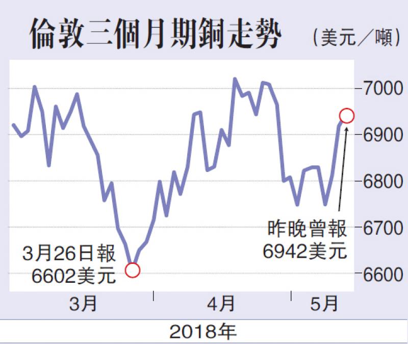金屬市場分析師預期,倫敦三個月期銅價格一度升穿阻力位6932美元,便會升向每噸7000美元水平;反觀若銅價不能守穩6902美元,可能跌向6847美元水平。