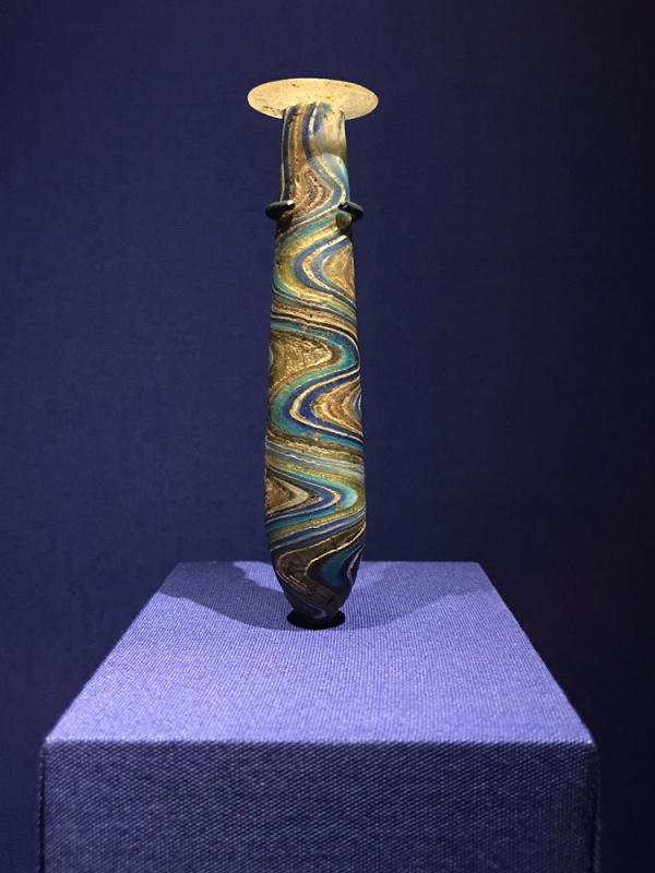 儘管在留英學習的時光中逛過多次大英博物館,對其館藏的地中海及中東文物仍略有印象,但必須承認,此次香港歷史博物館中展出的文物仍令我大飽眼福。若非親眼所見,真的難以想像那個如七彩礦物質版亮麗的細瓶竟然是當時盛放女性化妝品或精油的彩色玻璃香油瓶。刻有錯綜複雜的動物、人物及幾何圖案紋樣的青銅腰帶;雕有被植物和蓮花包圍的女性與騎士,用來盛放化妝品的巨型鱗硨磲殼;以及那些因獅子崇拜而創造出的帶有雄獅元素的香薰爐、黏土罐、桌椅腿、黃金配飾、劍柄圓頭以及容器的三腳支架等,所展出的歷史文物不僅將兩河流域地區對圖案紋樣天生的敏銳和審美偏執展現得淋漓盡致,更是足以印證當時的雕刻工藝、金屬冶煉技術和造型設計早已登峰造極。