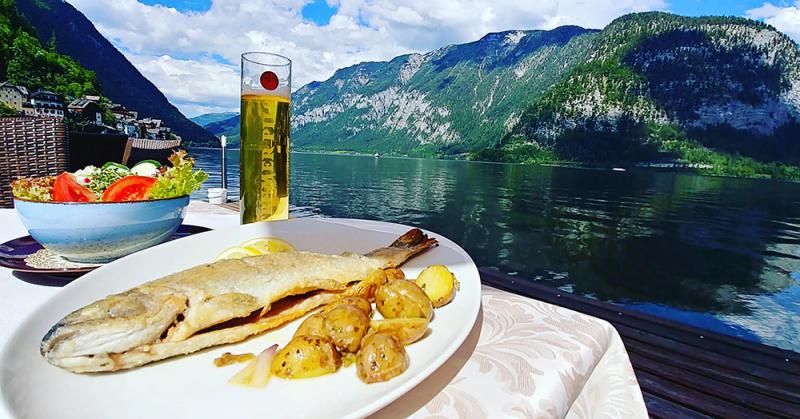 坐在湖邊的Gruner Baum餐廳點一條烤鱒魚,小心翼翼地從中間橫向切開,挑出魚骨,擠上少許檸檬汁就可以開動了,主食則是健康又香噴噴的煮薯仔。面前就是美得有靈性的哈修塔特湖,湖面還不時有天鵝划過,有種在畫中就餐的幻覺。