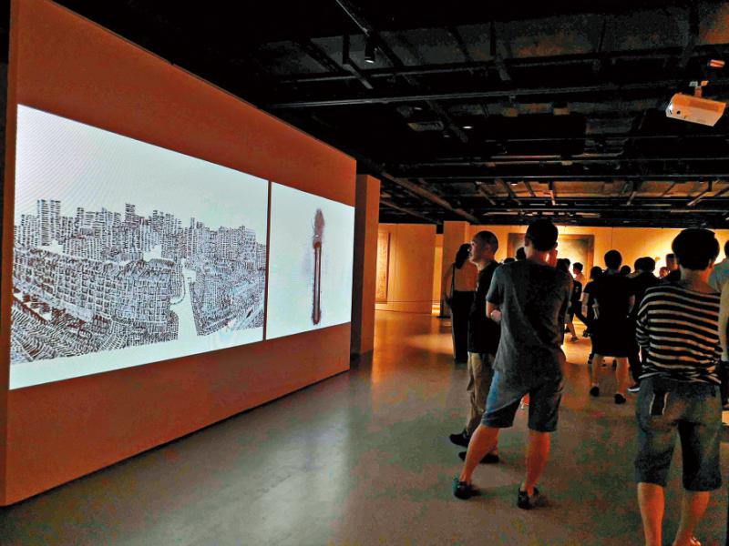 此次展出的定格動畫裝置《消失之中》時長二十分鐘,二○一四年創作。記者看到,這是一個雙視頻的定格動畫作品。右面的動畫是一枝不斷變小的粉彩畫筆,左面的動畫則看到觀塘市中心的繪線畫逐線成形,兩邊視頻同步發生。