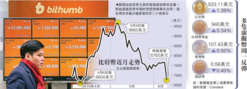 韓國加密貨幣交易所報稱遭到黑客攻擊,惹起虛擬貨幣市場的恐慌情緒再次出現,而隨着虛擬貨幣今年的沽售加劇,整個市場在過去周末期間的市值大幅蒸發420億美元(約3276億港元)。比特幣價格周日曾低見6693美元,其後周一回升至6763美元;其他虛擬貨幣包括以太幣等於於周末期間的跌幅均超過11%,周一則回升。/大公報記者 鄭芸央