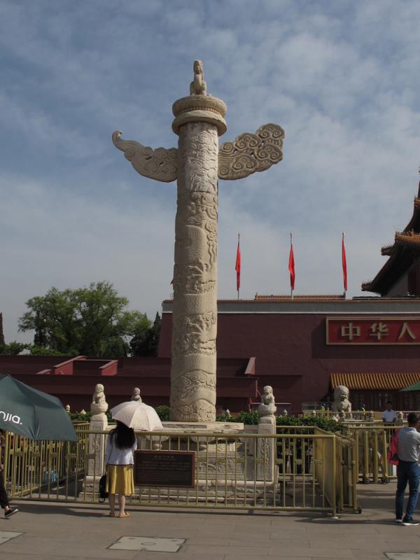 明永樂建成北京宮殿,大臣楊榮《皇都大一統賦》描述承天門(天安門)前華表:「若夫飛閣峨峨,實為承天(承天門);繡楹霧簇,畫栱星聯;踞石猊(石獅)之盤礴,竦華表之巋然。」清代《順天府志》描述:「長安門內正中南嚮者,為天安門。……是為皇城正門。門五闕,重樓,九楹,彤扉三十六。門外華表柱二,金水橋環之;門內亦華表柱二,東西兩廡各二十六間。」