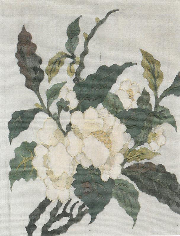自北宋始,詩人畫家始漸多以山茶花為題材;但迄明、清,繪山茶花獨創一格和以「韻勝」者甚少。宋徽宗和清代郎世寧等,均用院體派畫法,明艷妍麗有餘,卻畫不出山茶花的真性情。惲壽平雖用近「沒骨法」出之,但仍屬當時宮廷栽植的九心十八瓣或似牡丹型的大紅茶和如薔薇的瑪瑙瓣;與明代宣德剔紅漆器的大紅山茶一樣,俱缺靈氣。反而明代緙絲的白山茶花(見附圖博物館藏品,局部),不但工藝卓絕,更有出塵之感。