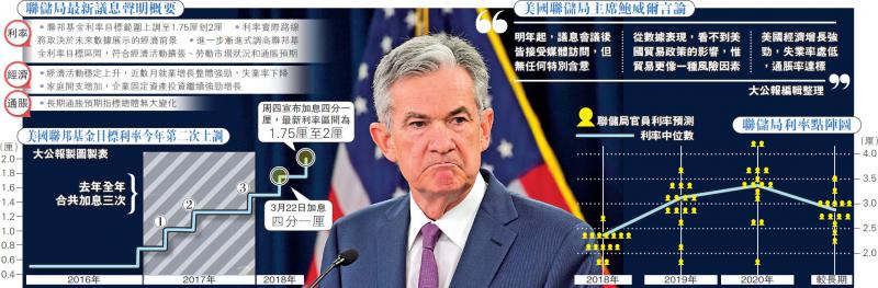 美國聯儲局結束一連兩天的議息會議,於香港時間周四凌晨宣布加息四分一厘,並暗示今年內預計再加息兩次,聯儲局主席鮑威爾稱美國經濟表現強勁,加息過快或過慢均可能有害。亞洲股市全線下跌,MSCI亞太區股市曾跌1%;歐洲股市開市腳軟,斯托克歐洲600指數早段跌0.5%,為兩周最大跌勢,英、法、德三大股市跌幅介乎0.6%至0.7%。美國十年債息周四升近3厘,美股早段造好,道指曾升101點,報25302點;納指升見7750點新高。/大公報記者 鄭芸央