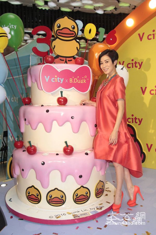 佘詩曼與跟她一樣高的巨型蛋糕合照。大公報記者吳珊珊攝