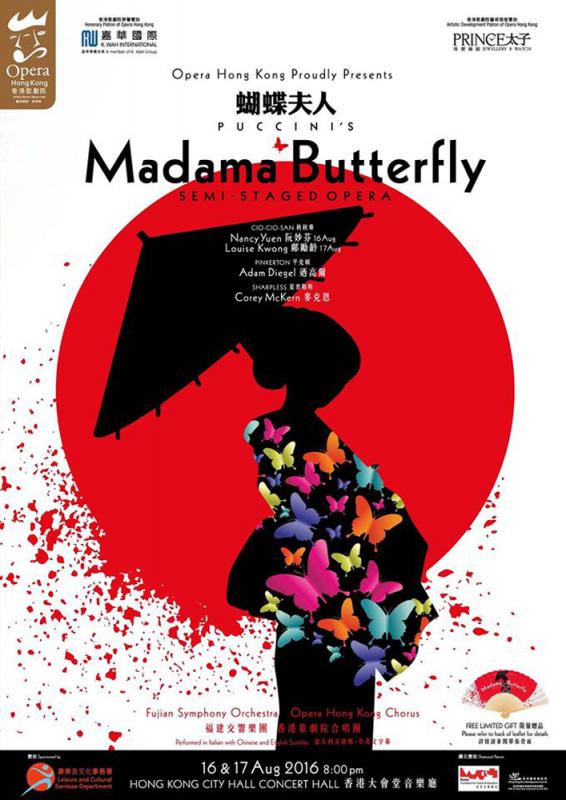 《蝴蝶夫人》是知名歌劇作家浦契尼最鍾愛的作品,是結合東方文化和西方傳統歌劇的完美典範。此次的女主角秋秋桑(蝴蝶夫人)分別由香港女高音阮妙芬(八月十六日)和鄺勵齡(八月十七日)飾演,男主角美國軍人平克頓則由美籍男高音迺高爾(Adam Diegel)飾演,同為美籍的男中音麥克恩(Corey Mckern)則飾演夏普勒斯。
