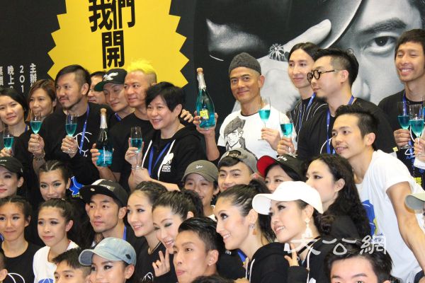 郭富城與經理人小美完騷後在後台與團隊開香檳慶祝。大公報記者吳珊珊攝