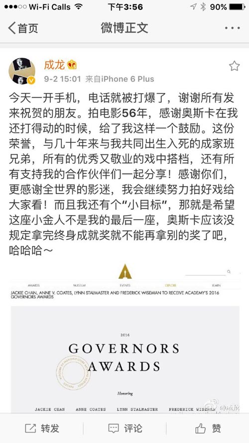 成龍其後在微博貼文發表得獎感受。「今天一開機,電話就被打爆了,謝謝所有發來祝賀的朋友。我6歲開始拍電影,到今年已經56年,作品超過200部,很感謝奧斯卡於我還打得動的時候,給了這一個鼓勵,也非常榮幸成為第一次獲得這個榮譽的華人。很多年前成家班就經常說一句話「We don't ask why, we just do or die」這是他們的的信條 ,也是所有動作電影人的態度。拍動作電影很辛苦,受傷流血是常事,很多人都落了一身傷病,我自己也不例外。所以奧斯卡這份榮譽,我要把它要與幾十年來與他共同出生入死的成家班兄弟,與全世界的動作電影人一起分享!感謝我的家人,感謝多年來所有優秀又敬業的戲中搭檔,還有所有支持他的合作夥伴。而且我有個小目標,那就是希望這個小金人不是我的最後一座,奧斯卡應沒有規定拿完終身成就獎就不能再拿別的獎了吧!最後,感謝全世界一直支持我 的影迷們,影迷是是我繼續前進的動力。 」