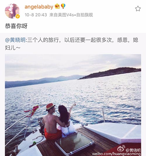 黃曉明昨晚update了微博,相中見到他與Baby出海,雖然只得Baby的背影以及黃曉明的側面,但仍感覺到他們一臉幸福,黃曉明更留言說:「三個人的旅行,以後還要一起很多次,感恩,媳婦兒」。