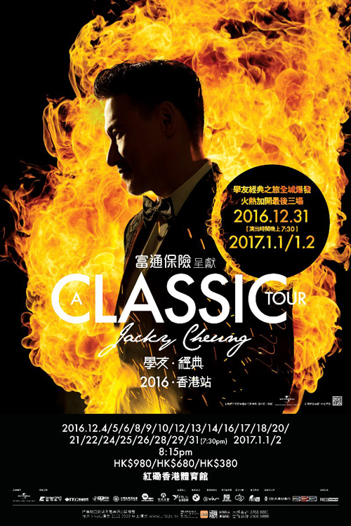 大公網10月10日訊(記者吳珊珊)「歌神」張學友「A CLASSIC TOUR 學友·經典世界巡迴演唱會」香港站將於12月4日正式在紅館揭幕,在上月20日開售由12月4日至12月29日共二十場門票,一經開售即被瘋狂地搶購一空,學友在徇眾的苦苦要求下,決定在香港站加開終極的三場演唱會,分別是2016年12月31日、2017年1月1日和1月2日,一共在香港站舉行二十三場,由於受場館的檔期所限,這三天真正是香港站的最後三場,絕不可能再加場,而這三場的門票將於10月14日起在城市售票網開始公開發售。至於12月31日因交通管制封路的問題,當天演出會特別提早於晚上七時三十分開場,希望歌迷們於完場後亦能趕上迎接2017年的來臨!