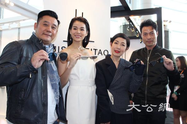 右起張達倫、黎芷珊、胡杏兒及麥長青齊齊展示最新款太陽眼鏡。大公報記者吳珊珊攝