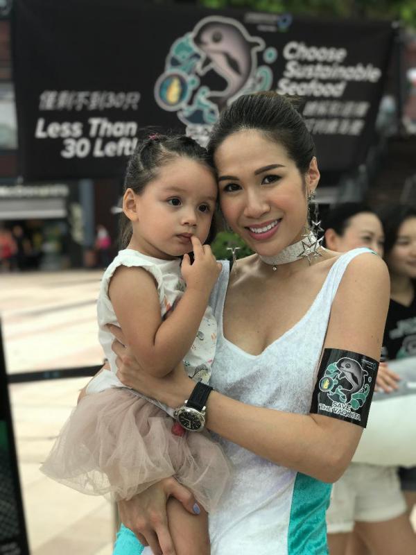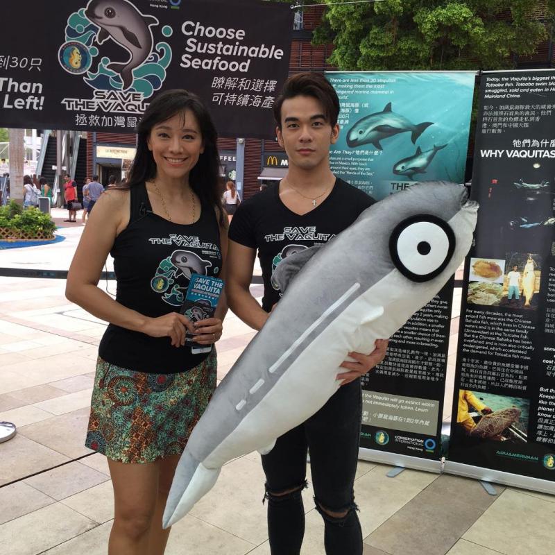 大公網7月8日訊(記者吳珊珊)一向致力海洋保育的郭秀雲,今天聯同「熊貓海豚大使」莊思明(Lisa) 、黃美棋與男友鍾健威到赤柱廣場出席「國際拯救加灣鼠海豚日嘉年華」,Lisa還帶同「熊貓海豚小朋友大使」Evelyn Roach一起亮相,眾人一起呼籲大家停止購買加灣石首魚花膠,同時希望當地政府可以加緊打擊非法和使用剌鈎捕魚,注視非法走私加灣石首魚魚瞟,令無辜的「海中熊貓」加灣鼠海豚可以持續活在世上。