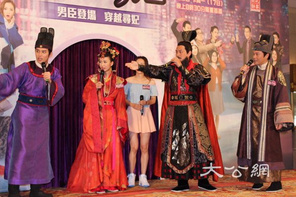 大公網7月12日訊(記者吳珊珊)昨日剛剛舉行完婚禮的王君馨(Grace),今天聯同蕭正楠、曹永廉(阿廉)、何廣沛及吳業坤等,出席無綫下周一推出的新劇《超時空男臣》的宣傳活動,劇中三位男臣阿蕭、阿廉及何廣沛齊齊以古裝造型亮相,穿越來港尋找太子妃Grace,阿廉見Grace一身紅彤彤打扮,即搞笑問她為何又穿上新娘裝,何廣沛更笑問:「你改嫁呀?」令人捧腹。之後阿廉拉起Grace的裙子找尋玉配,阿蕭即笑說:「你鑽進去吧!」全場爆笑。
