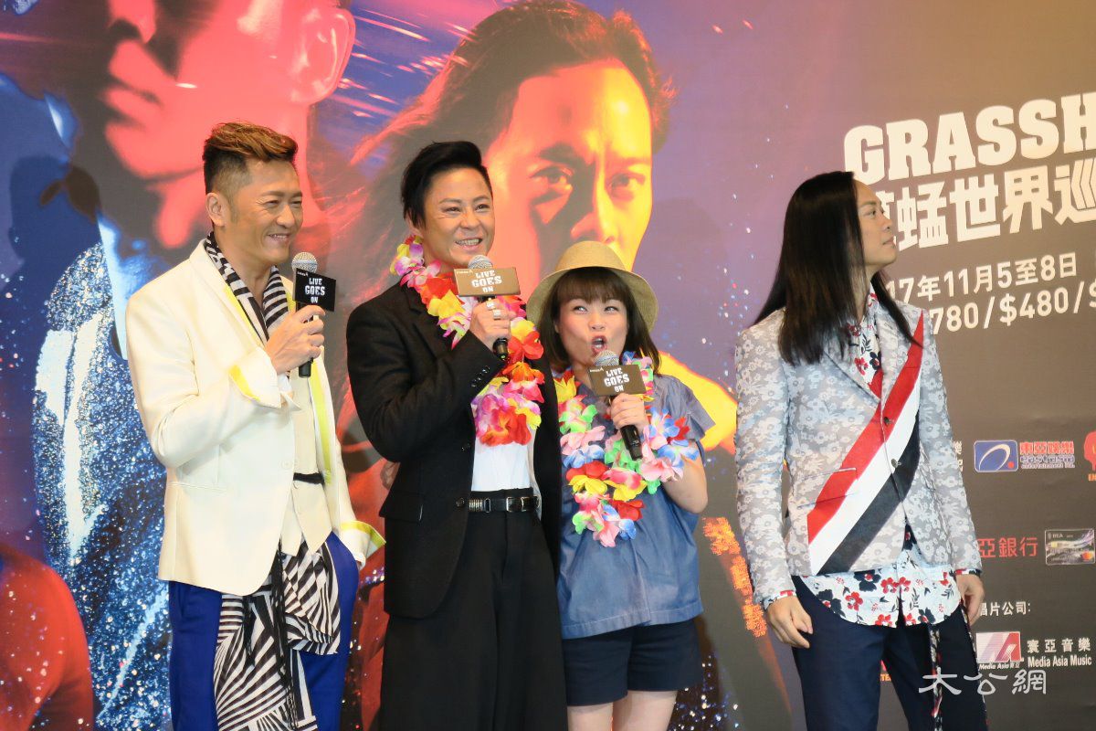 大公網7月18日訊(記者溫穎芝) 「草蜢世界巡迴演唱會2017」將於11月5日至8日於紅館舉行,今天舉行記者會宣布門票明天便公開發售。不少圈中好友如鄭伊健、楊千嬅、容祖兒特都拍下片段祝賀。草蜢表示每次開演唱會前,都會想怎樣去突破,今次都一樣。這次演唱會的RUDOW會像一個旅程一樣,他們會唱很多以前的歌曲,呼籲「鐵粉」們記得背熟歌詞。但因為歌曲太多,暫時還未知會否請嘉賓。