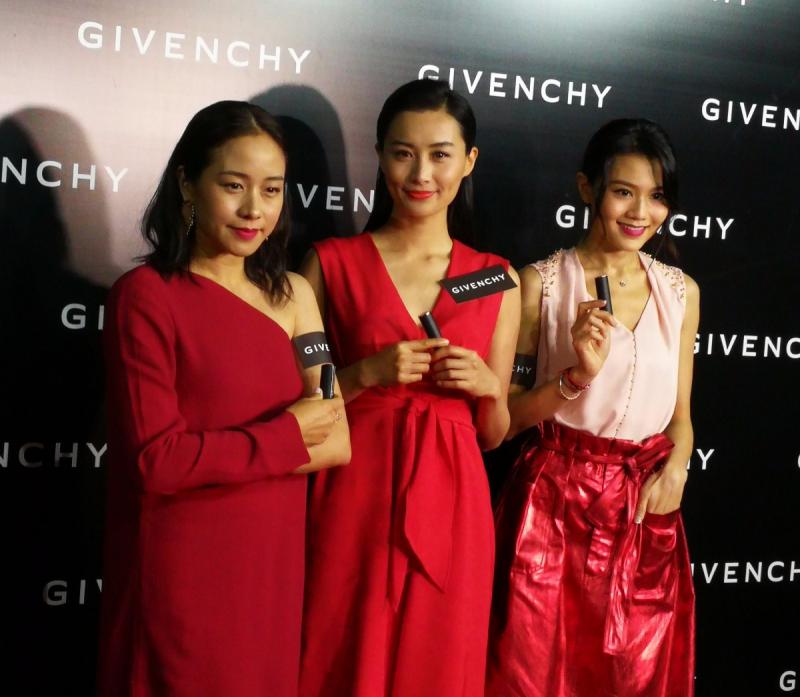 右起林嘉欣、陳法拉及周秀娜一起出席唇膏活動