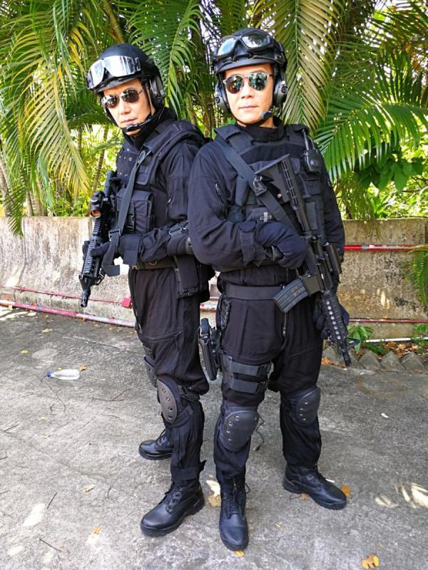 大公網8月15日訊(記者吳珊珊)苗僑偉(三哥)、黃宗澤、吳卓羲、張兆輝、王敏德、高海寧及王敏奕等,今天在西貢蠔涌成豐片場為邵氏網劇《飛虎極戰》拍攝一場營救人質戲,一眾飛虎隊員在直升機上游繩而下去對付恐怖分子,由於天氣酷熱氣溫高達攝氏33度,但眾演員均以飛虎裝束上陣,問他們可擔心中暑?三哥直言大吉利是,又謂他們經常在烈日下踢足球,已訓練有素,加上已立秋,今天又有微風,已算好些了。