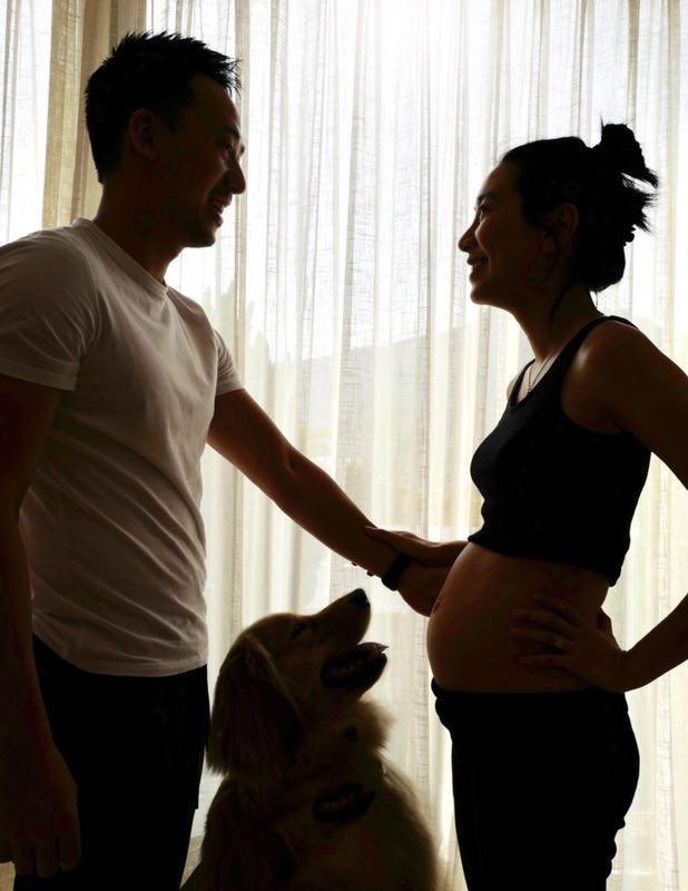 懷孕五個月的吳雨霏,與老公及愛犬合照。