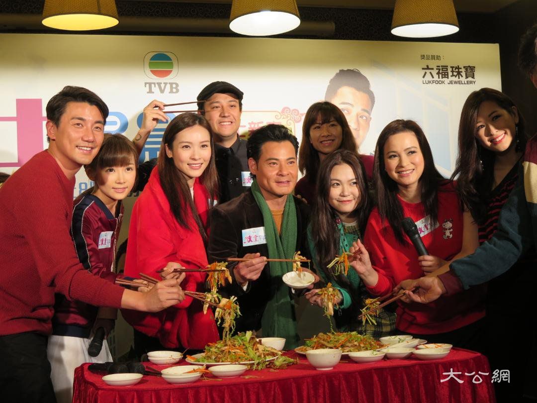 左起洪永城、李佳芯及黃智賢等演員齊齊進行「撈起」儀式,寓意收視高升。(大公網記者吳珊珊攝)
