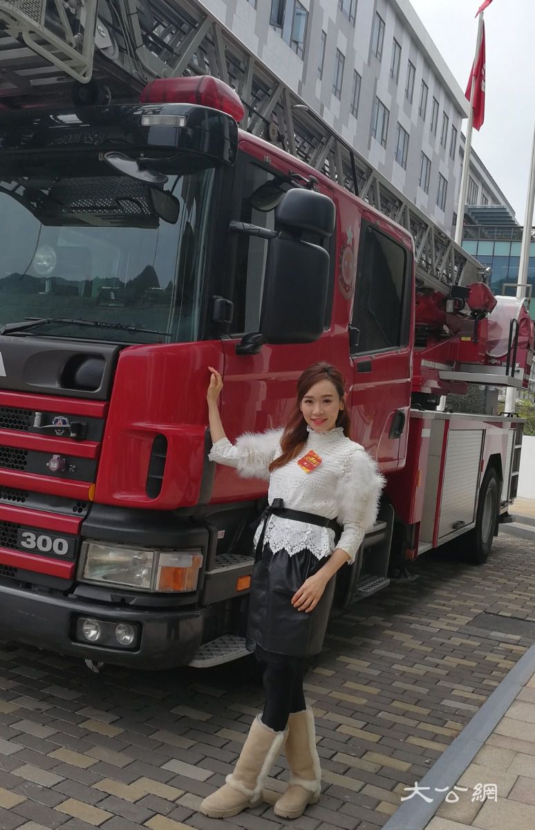 楊思琦趁機在消防車旁拍照留念(大公報記者吳珊珊攝)