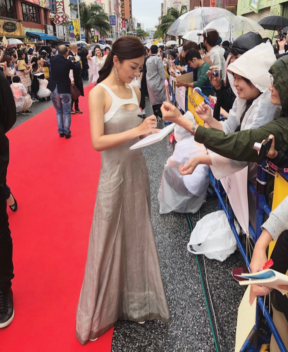 大公網4月23日訊(記者 溫穎芝)「第10屆沖繩國際電影節」剛剛在沖繩舉行,衛詩雅(Michelle)帶住主演新片《熟女愛漫遊》參展,更是今屆唯一一套香港電影入圍觀賞環節。雖然近日沖繩爆發麻疹疫情,電影節舉行當日又遇上雷雨,但仍無損Michelle的興奮。Michelle穿起灰白晚裝戰衣行紅地毯,盡顯女人味。她說:「紅地毯環節差點因為大雨而取消,幸好後來雨勢漸小才有得行。當地人好熱情,著雨褸拎遮都堅持出來支持。」
