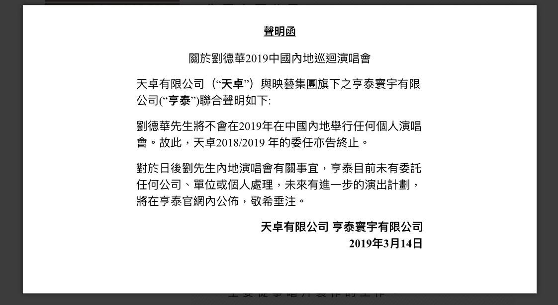 劉德華先生將不會在2019年在中國內地舉行任何個人演唱會。故此,天卓2018/2019年的委任亦告終止。對於日後劉先生內地演唱會有關事宜,亨泰目前未有委託任何公司、單位或個人處理,未來有進一步的演出計劃,將在亨泰官網內公布,敬希垂注。