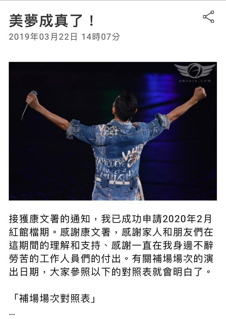 華仔早前已透露是次補辦演唱會,假如每位觀眾都回來睇騷,基本上是無法再次公開售票,所以最少要申請7天檔期,華仔亦決定自資補辦個唱,今日終於在官網宣布接獲康文署通知,成功申請2020年2月紅館檔期,於2月15日至22日舉行7場個唱。