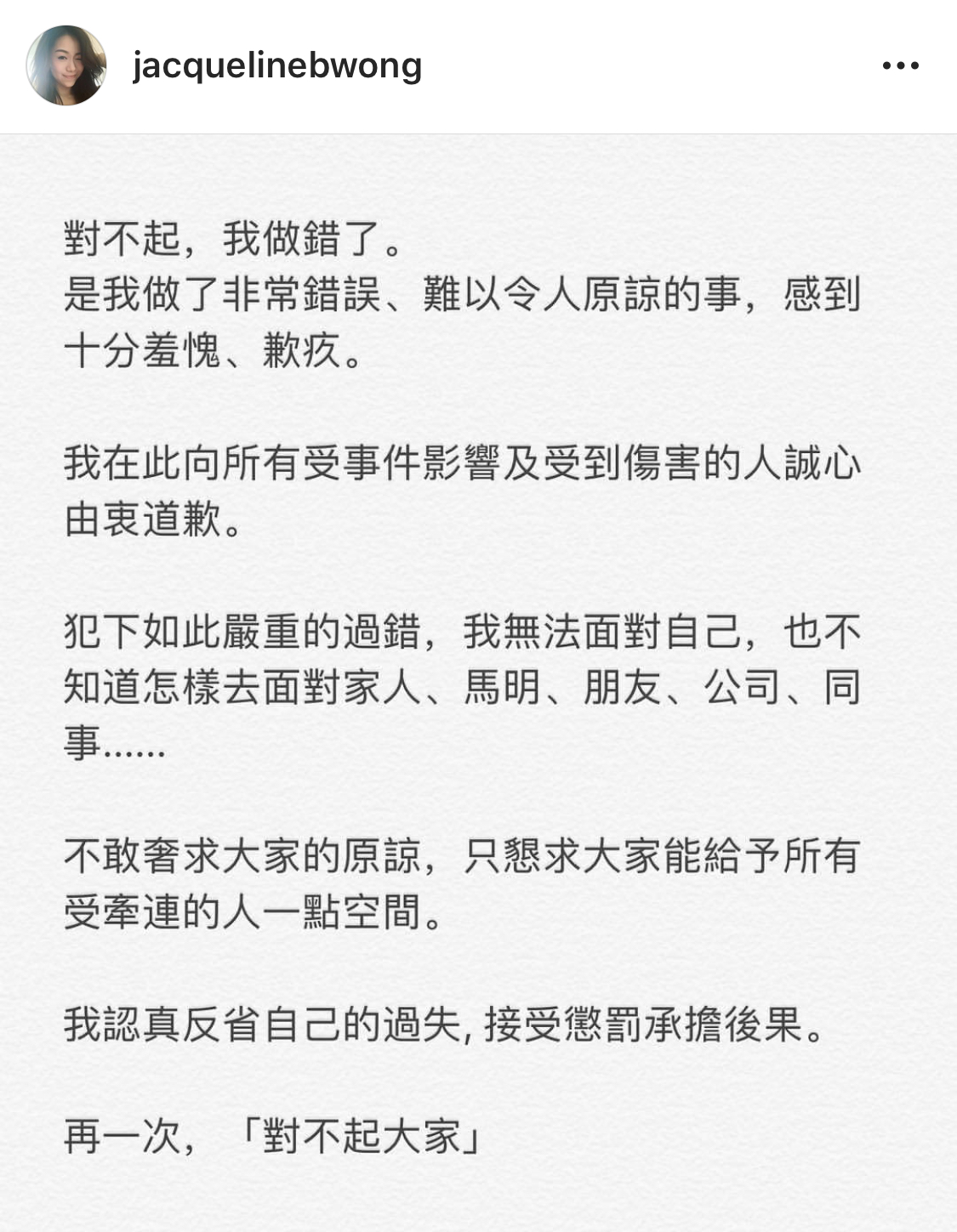 犯下如此嚴重的過錯,我無法面對自己,也不知道怎樣去面對家人、馬明、朋友、公司、同事……不敢奢求大家的原諒,只懇求大家能給予所有受牽連的人一點空間。