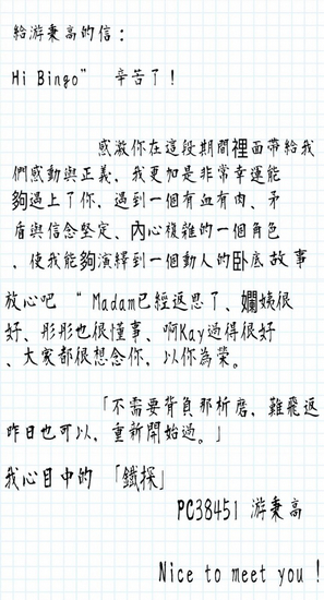 劇中Bingo死前分別寫了三封信給媽媽(盧宛茵)、垶Sir(袁偉豪)及萬晞華(惠英紅),而現實中黑仔亦感觸良多,角色雖已結束,但仍以Bingo的身份,給自己感性地寫了一封信。他在信中寫道:「Hi Bingo」 辛苦了!感激你在這段期間