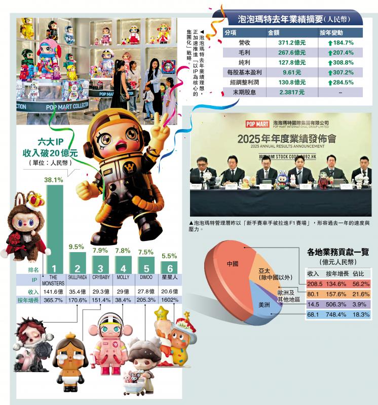 隨着星星人、Labubu等IP成功在全球走紅,泡泡瑪特(09992)昨日公布亮麗的業績表。去年純利127.8億元(人民幣,下同),按年大升308.8%。面對市場對高增長的期待,集團主席兼行政總裁王寧以「賽車新手被拉進F1賽場」,形容過去一年的速度與壓力。他直言今年集團將「進維修站換輪胎、加油」,追求持續健康成長,力爭實現不低於20%的增長。\大公報記者 李樂兒