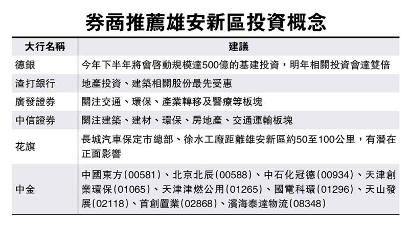 渣打銀行中國財富管理部投資策略總監王昕傑指出,最先受惠的股份是已經在當地有投資及建築相關股份,廣發證券建議關注交通、環保、產業轉移及醫療等板塊投資機會,重點受益行業包括雄安新區內的房地產、鋼鐵、水泥等。