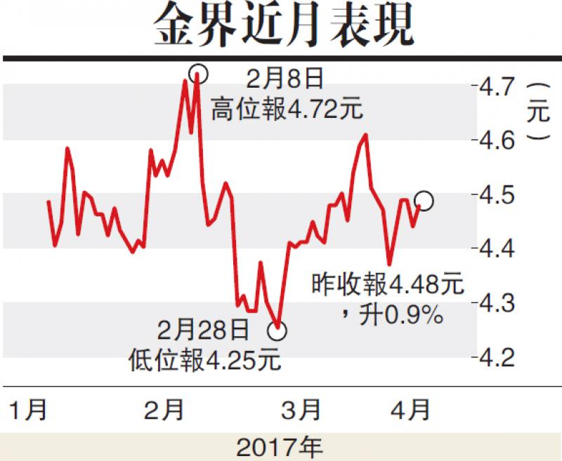 金界昨天股價向好,開市早段一度抽高1.8%,高見4.52元,收市報4.48元,升0.9%。