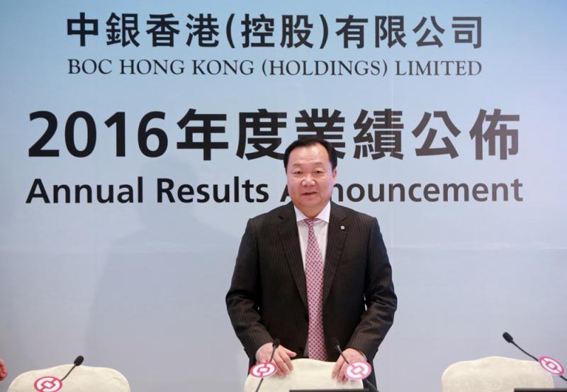 圖:中銀香港昨日升幅入藍籌三甲,後市仍值得看高一線,圖為中銀香港副董事長兼總裁岳毅日前出席業績發布會