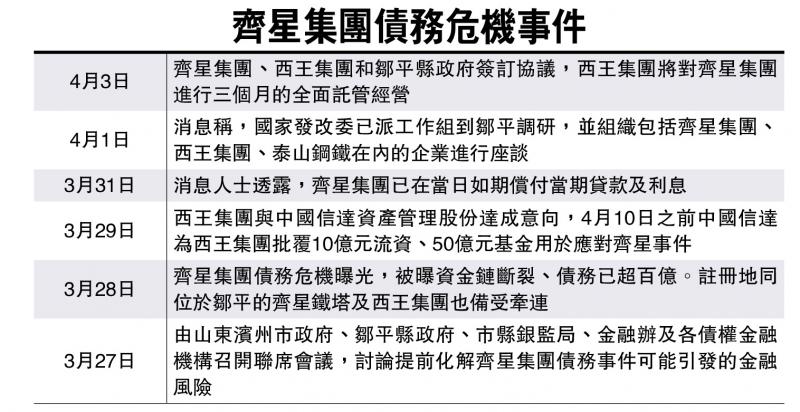 【大公報訊】齊星集團的債務危機有望化解。新華社引述山東省鄒平縣政府消息,昨日上午,齊星集團、西王集團和鄒平縣政府已簽署《委託經營三方協議》。據此,西王集團將對齊星集團進行為期三個月的全面託管經營,三方可根據實際情況,調整託管期限。鄒平縣政府表示,目前,當地黨委政府、域內金融機構和相關企業正全力配合,託管經營等相關工作正在推進。