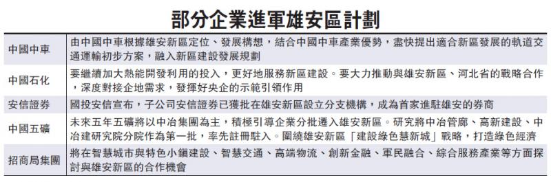 業內人士認為,雄安新區的建設與發展離不開金融的支持,但由於雄安新區仍處於建設初期,且相關配套政策也未正式出台,因此作為內地經濟主力軍的央企,其加入新區建設的實質性動作,一方面可以成為雄安新區建設的壓艙石,穩定雄安新區建設的基礎,另一方面對於吸引更多社會資本投入,同樣具有引導性作用。
