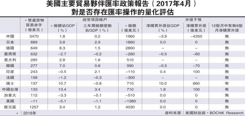 瑞士是美國主要貿易夥伴當中匯市干預最重手的經濟體,在2016年其淨購匯660億美元,相當於GDP的比率高達10.0%,另外瑞士的經常帳盈餘也高達GDP的10.7%,瑞士之所以未被指控操縱匯率,是因為其對美貿易盈餘為137億美元,離200億美元的門檻還有一定距離。不過,美國財政部對瑞士匯市干預的態度就並非十分強硬,指是避險資金大規模流入所致,而且同意國際貨幣基金組織(IMF)的建議,即今後的匯市干預應只限於管理避險資金的流入。這樣的取態可為中美之間就匯率問題的協商提供有用的啟示。