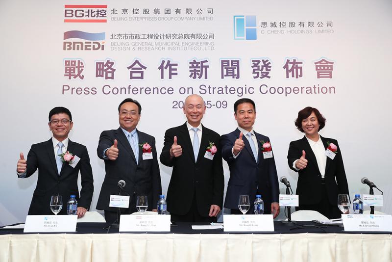 圖:圖左起為思城行政總裁符展成、北控副總經理姜新浩、思城主席梁鵬程、北京市政總院董事長劉桂生,以及北京市政總院總經理張韻