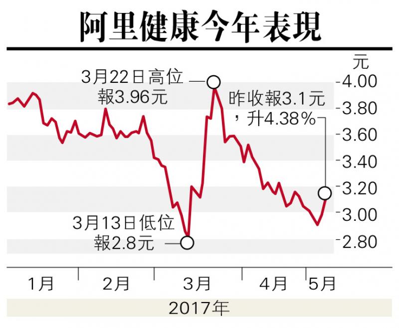 阿里健康昨日股價跑贏大市,午後一度炒高逾6%,高見3.16元,收市報3.1元,抽高4.4%。