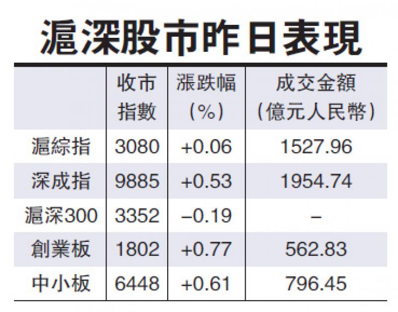 截至收盤,滬綜指報3080.53點,漲0.06%;深成指報9885.34點,漲0.53%;創業板指報1802.49點,漲0.77%。兩市合計成交3482.70億元,較上一交易日大幅縮量20.40%。盤面上看,次新股、電力改革、軍工居板塊漲幅榜前列,受「火電、核電或將重組成三家」消息刺激,大唐發電漲停,華銀電力、華能國際、閩東電力、華電能源漲幅均超5%。