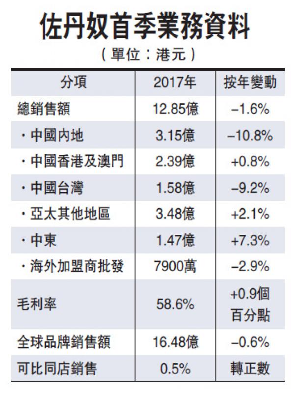 內地市場方面,今年首季貢獻銷售額3.15億元,按年下跌10.8%,按固定匯率計算則下跌6.1%,同店銷售由去年同期下跌3.3%,改善至今年首季增長0.4%。
